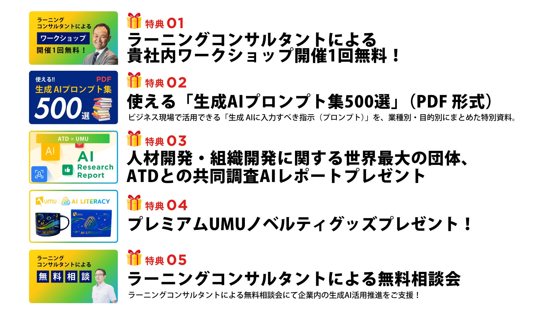 (1)ラーニングコンサルタントによる貴社内ワークショップ開催1回無料 (2)使える「生成AIプロンプト集500選」(PDF形式) (3)人材開発・組織開発に関する世界最大の団体、ATDとの共同調査AIレポート (4)プレミアムUMUノベルティグッズ (5)ラーニングコンサルタントによる無料相談会 |