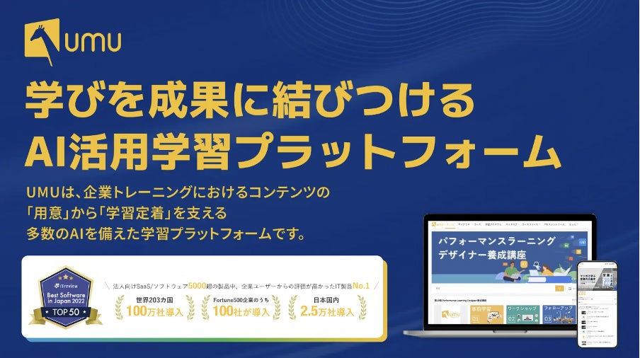UMUは、世界203の国と地域で100万社以上、日本では、日本生命、パナソニック、アステラス製薬をはじめとする約25,000社以上の導入実績があり、AI学習プラットフォーム市場を牽引しています。